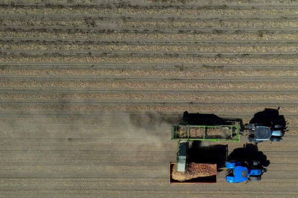 Een boer rooit zijn uien van het land