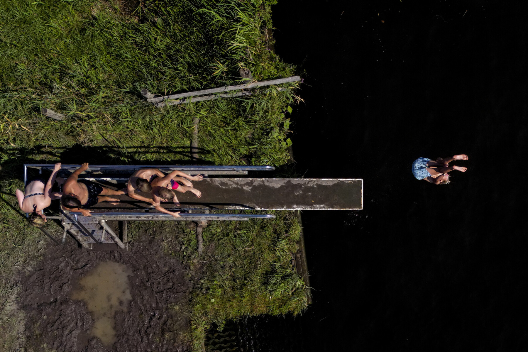 Jongeren maken gebruik van een duikplank die is geplaatst aan de rivier de Eem