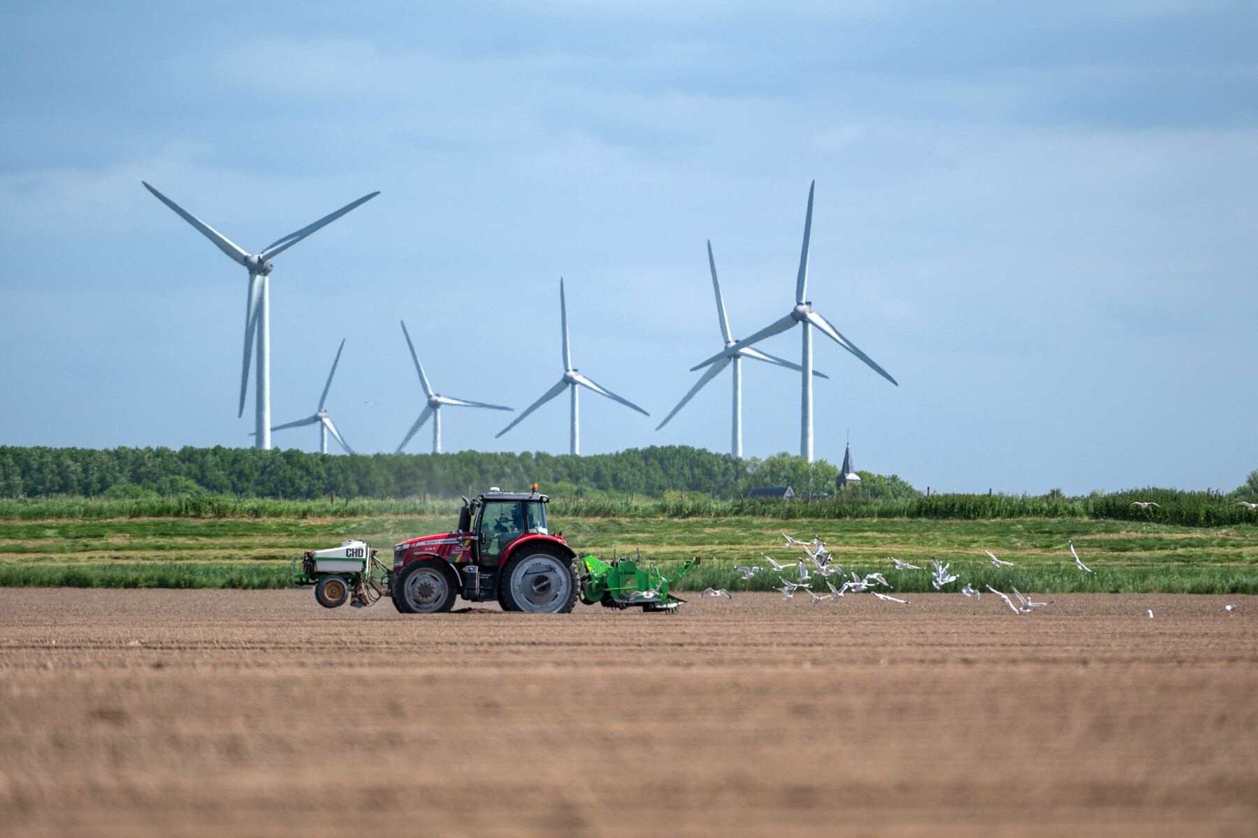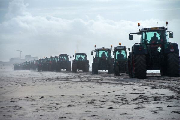 Boeren rijden na een protest terug naar het Westland via het strand van Scheveningen